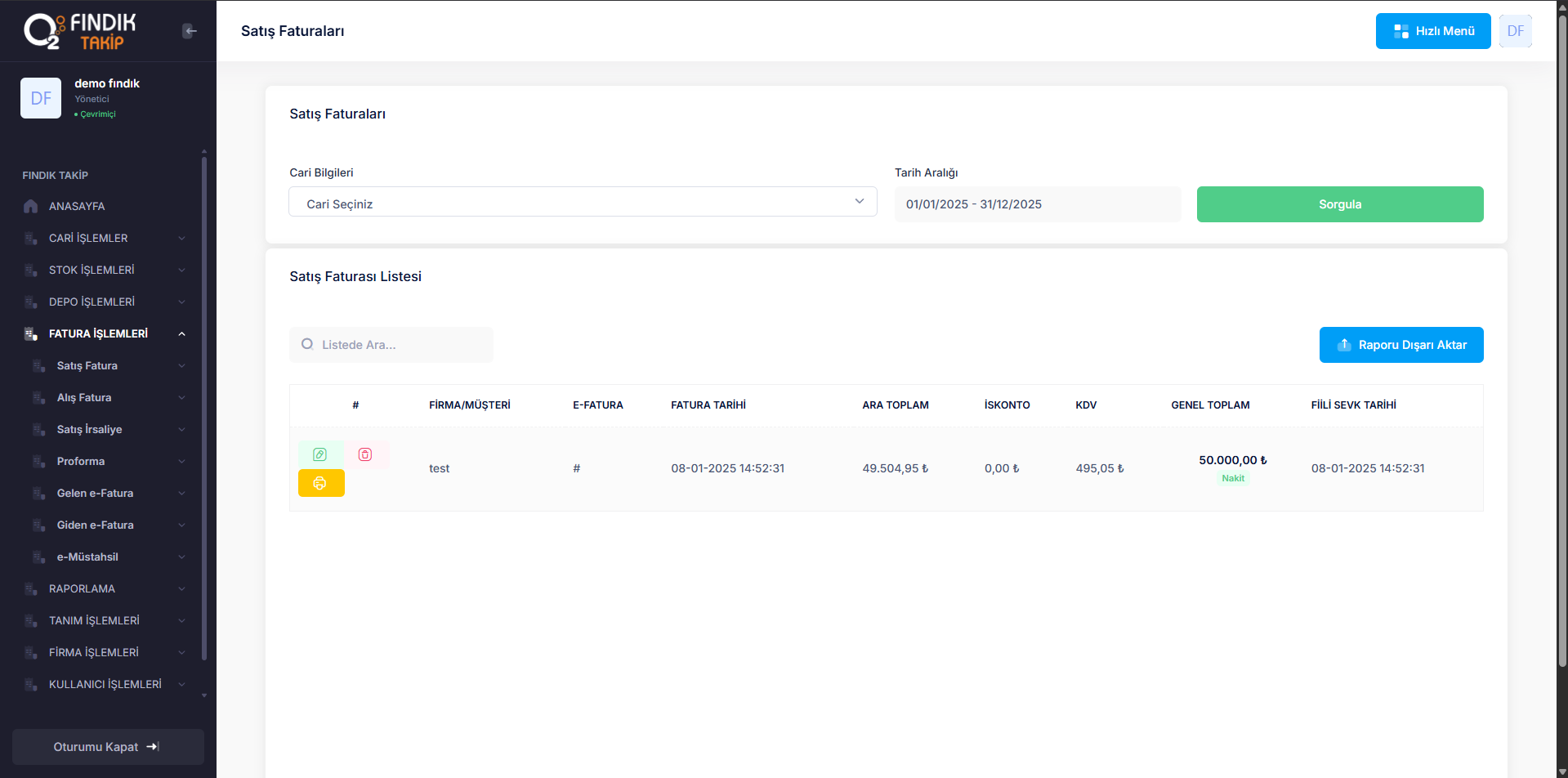 Fatura İşlemleri, fındık fabrikalarının finansal süreçlerini kolaylaştırmak ve mali yönetimlerini güçlendirmek için tasarlanmış etkili bir çözümdür. Bu sistem, alış ve satış faturalarının takibini, finansal hareketlerin izlenmesini ve mali verilerin analizini tek bir platformda birleştirerek işletmelerin gelir-gider dengesini daha iyi kontrol etmesini sağlar.