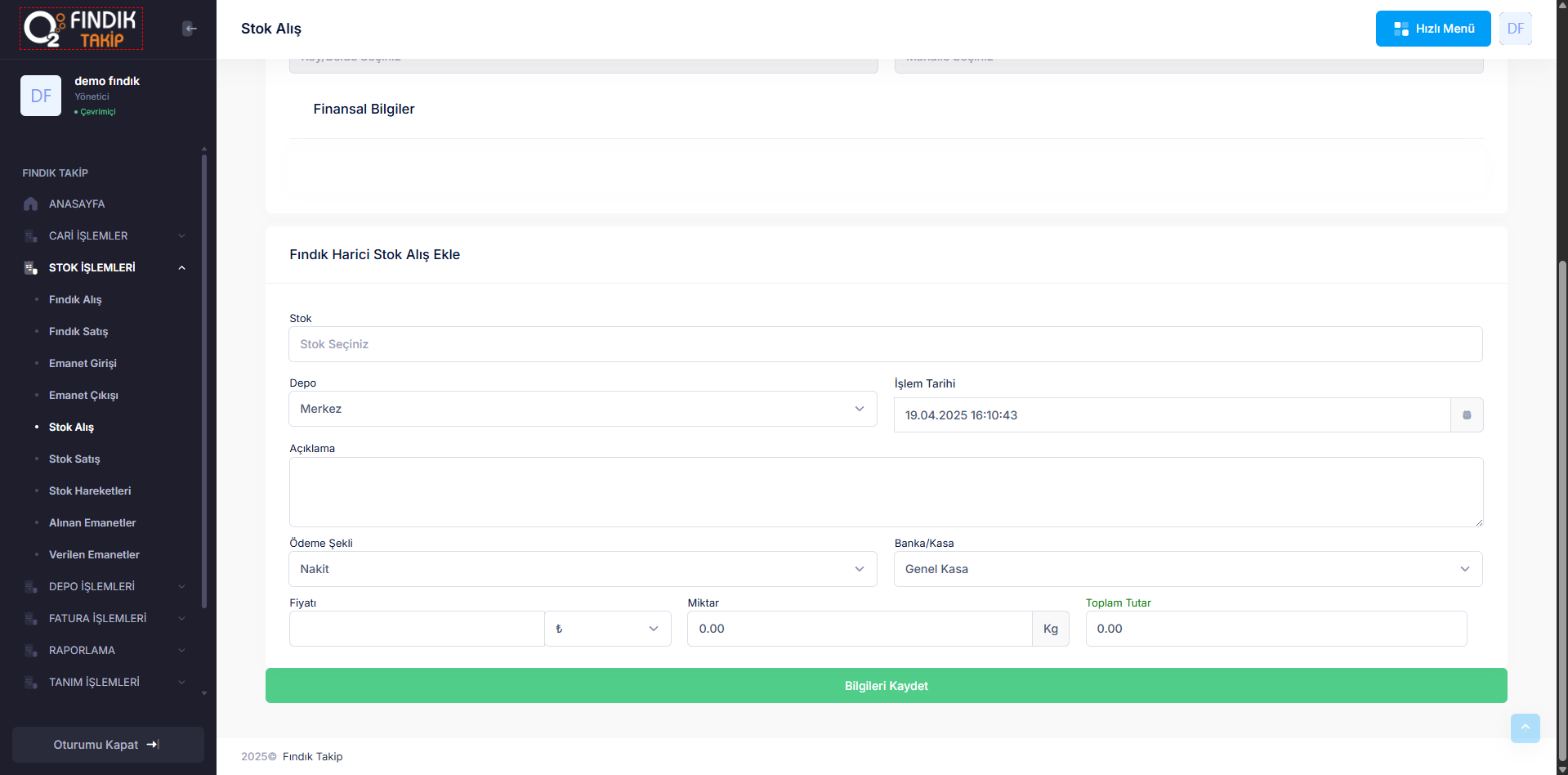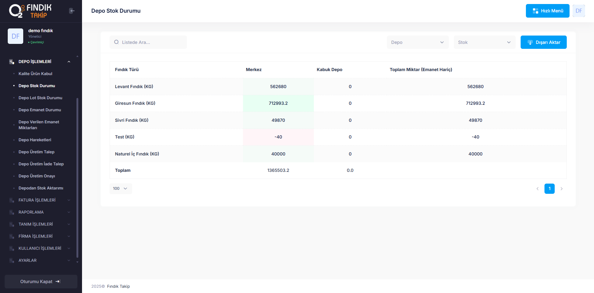 Stok Takibi, fındık fabrikalarının hammadde, yarı mamul ve nihai ürün stoklarını etkin bir şekilde yönetmek için tasarlanmış kapsamlı bir çözümdür. Fındık sektörünün dinamik yapısına uygun olarak geliştirilen bu sistem, stok hareketlerini gerçek zamanlı olarak izleyerek işletmelerin kaynaklarını verimli kullanmasını sağlar ve üretim süreçlerinde kesintisiz bir akış sunar.